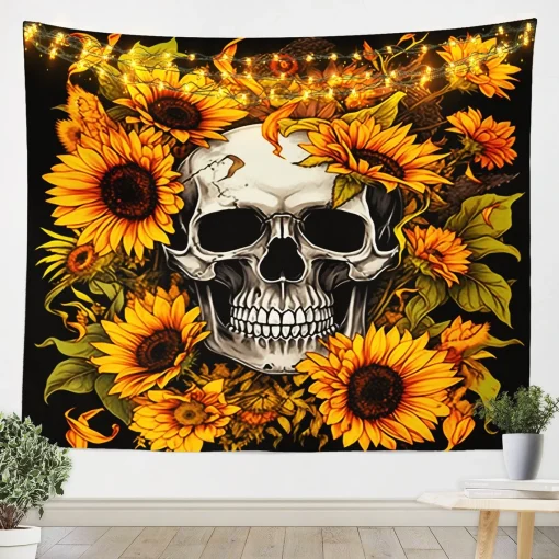 【Areas of Use】This Gothic skull wall tapestries adopt advanced digital printing. This sunflower skeleton tapestry feathers vivid colors, crisp lines and delicate hemming, adding your room a more permanent harmonious decoration. Great for wall hangings, beach throws, picnic blankets, porch hangings, table cloths, bed spreads, dorm decorations or a perfect gift for any occasion! Unique design can also suit your upholstery around all seasons, spring, summer, autumn and winter.